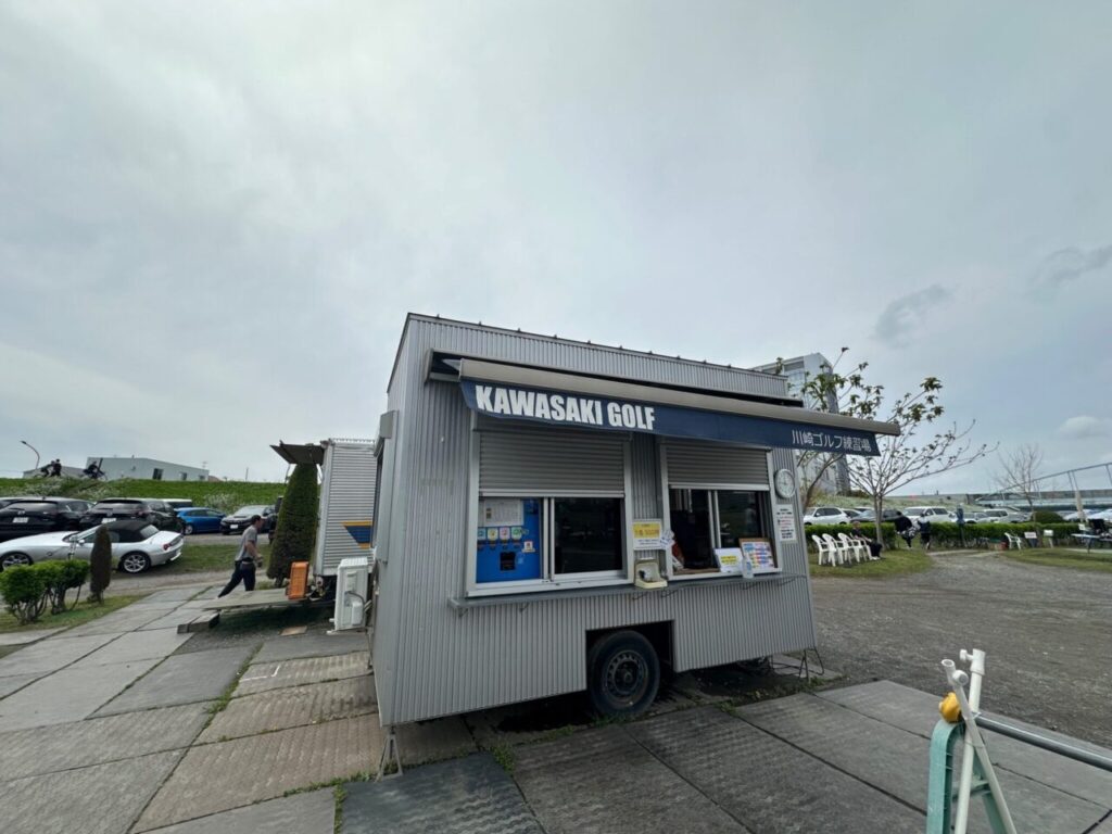 入口側には「KAWASAKI GOLF」の大きな看板があり、初めてでも場所がわかりやすい雰囲気でした。川崎ゴルフ練習場は神奈川県川崎市幸区小向仲野町6-5にあり、多摩川河川敷に面した練習場です。公式案内では、敷地面積55,283㎡、130打席、最大290ヤード、天然芝のフェアウェイを備えた大型施設とされています。