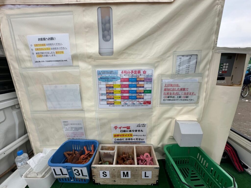 受付周辺には、サイズ別のティーが見やすく整理されていました。写真ではS・M・L・LL・3Lの表記が確認でき、必要なサイズを自分で選びやすいようになっています。細かな部分ですが、こうした備品のわかりやすさは、初めて行く人にとって安心材料になります。